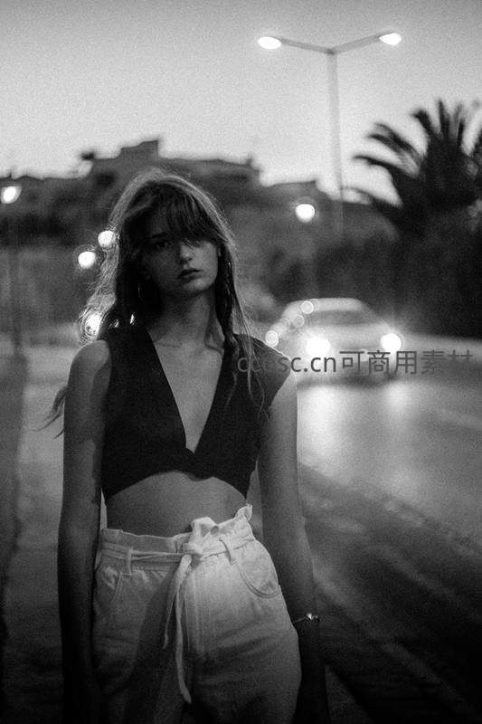 黑白影像中,一位女子伫立在夜晚街头,身后车灯与路灯交相辉映,她神情凝重,营造出一种孤独又充满故事感的都市夜景。