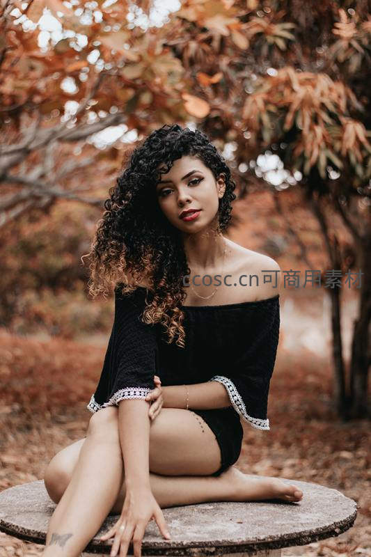 一位拥有浓密卷发的年轻女子,身着黑色露肩上衣,在铺满落叶的秋日林间,安静地坐在一张圆形石凳上,眼神温柔而深邃。