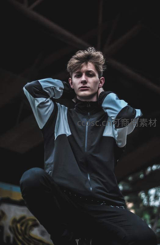 年轻男子身穿黑白撞色运动夹克,蹲坐于桥下阴影处,双手搭颈,眼神坚定,整体造型充满街头潮流与力量感。