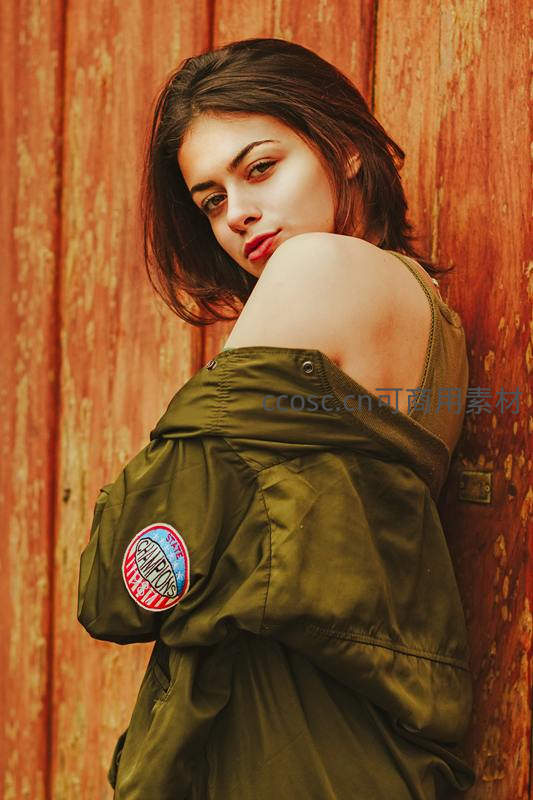 一位年轻女子身着橄榄绿飞行员夹克,随意披在肩上,倚靠在斑驳的橙红色木板墙前,眼神直视镜头,展现出自信与随性的时尚感。
