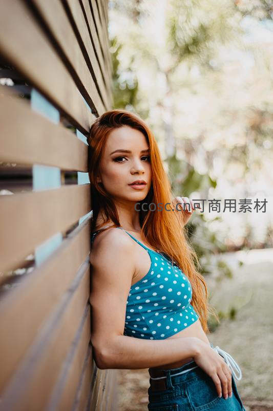 阳光下,一位红发女子身穿蓝底白波点吊带上衣,倚靠在木质栅栏旁,姿态优雅,眼神温柔,散发着夏日的清新与活力。