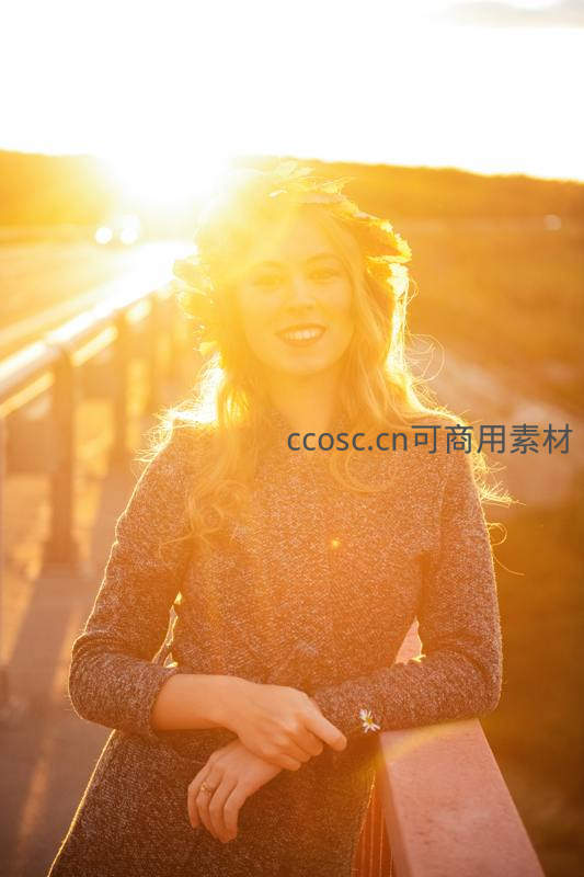 金色夕阳洒满桥面,女子迎光微笑,发丝被逆光染成金边,温暖而明亮的画面传递出幸福与希望的瞬间。