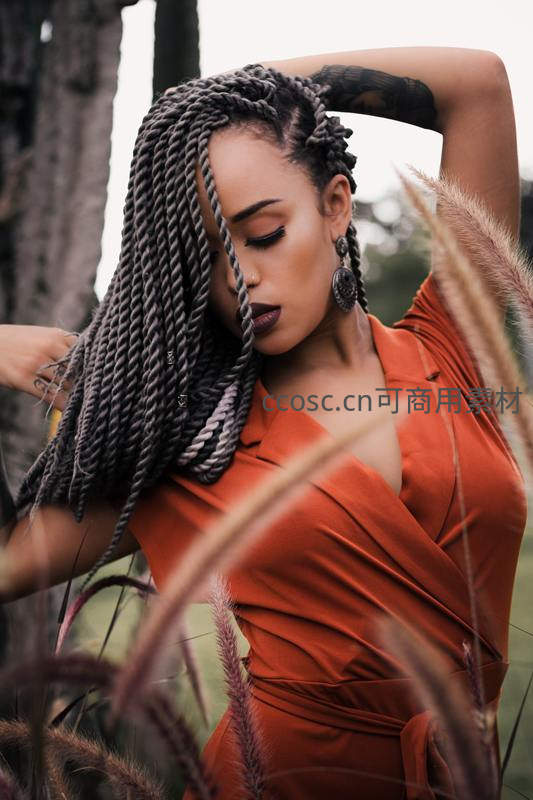 一位穿着鲜艳橙色连衣裙的女性站在高草丛中,灰黑相间的长辫垂落肩头,她一手轻抚发丝,背景是模糊的树木与芦苇,展现出自然与时尚交融的独特美感。