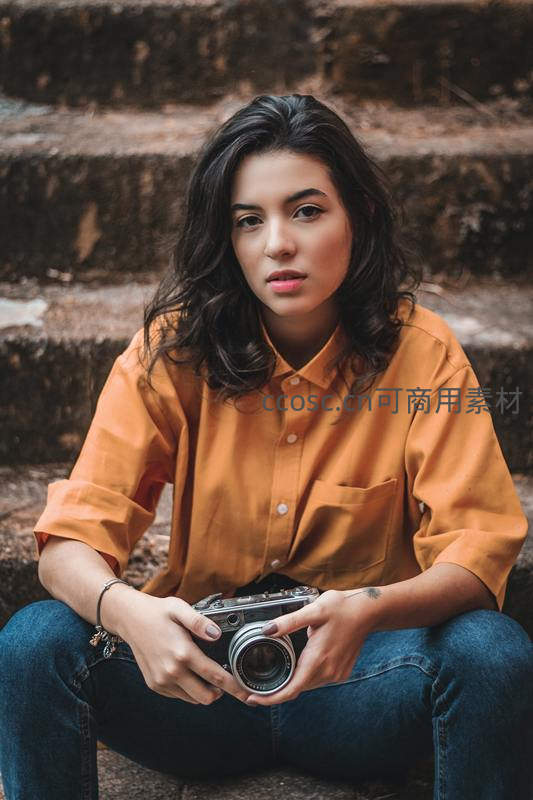 女孩坐在石阶上,双手捧着一台复古胶片相机,神情专注,橙色衬衫与深蓝牛仔裤搭配,散发浓郁文艺气息。