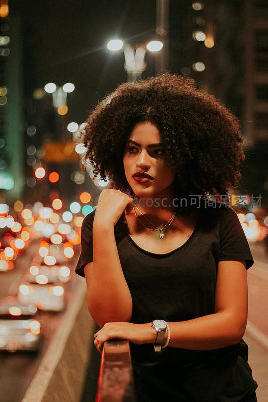 一位拥有蓬松卷发的年轻女性在夜晚的城市天桥上,背景是模糊流动的车灯与高楼,她神情沉静,姿态优雅,展现出都市夜生活的独特魅力。
