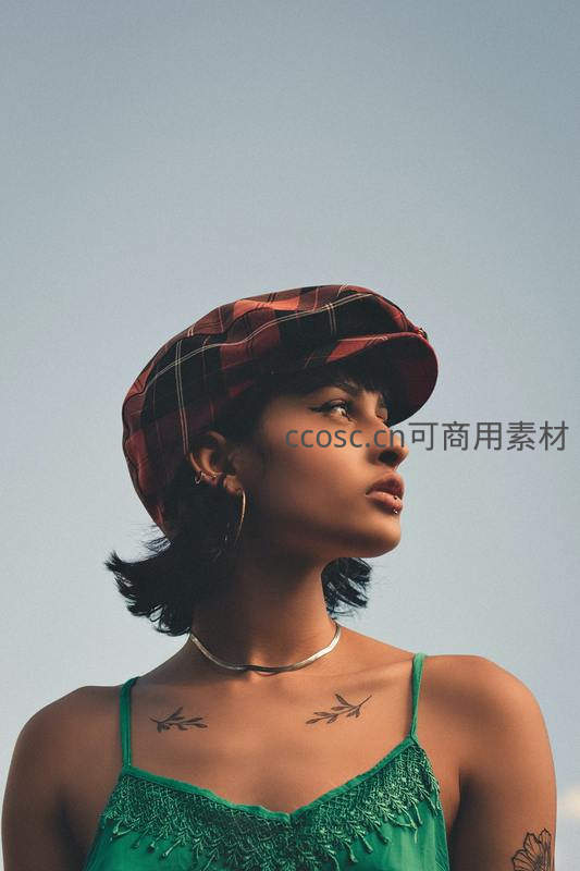 一位戴着红黑格纹贝雷帽的女性仰望天空,颈部和锁骨处有精致叶形纹身,身穿绿色蕾丝吊带,背景纯净天空凸显其独立与艺术气质。