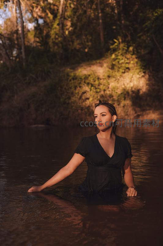 黑裙女子静坐溪流中沐浴夕阳