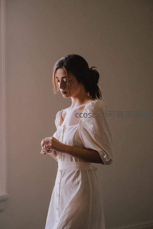 一位身穿白色连衣裙的女子在窗边安静伫立,柔和的光线勾勒出她沉思的侧影,营造出宁静而富有诗意的氛围。