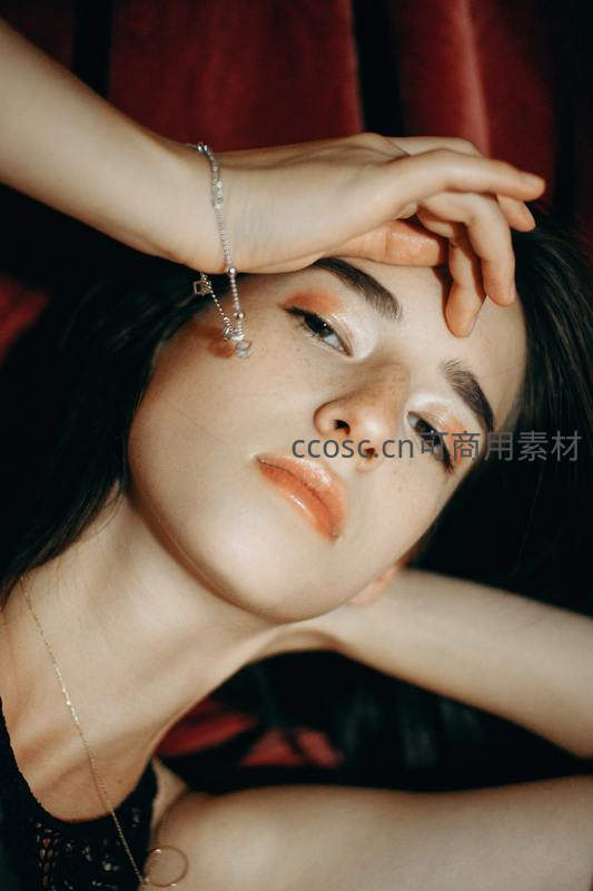 一位带有雀斑的年轻女性躺在深红色背景前,手轻抚额头,佩戴着精致的手链和项链,眼神略带迷离,传达出一种慵懒又富有情绪的美感。