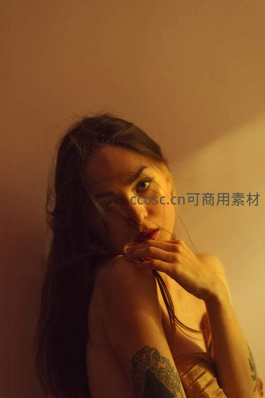 女子肩臂纹身隐约可见,在柔和暖光中轻触唇角,眼神直视镜头,流露出神秘与自信,画面充满故事感。