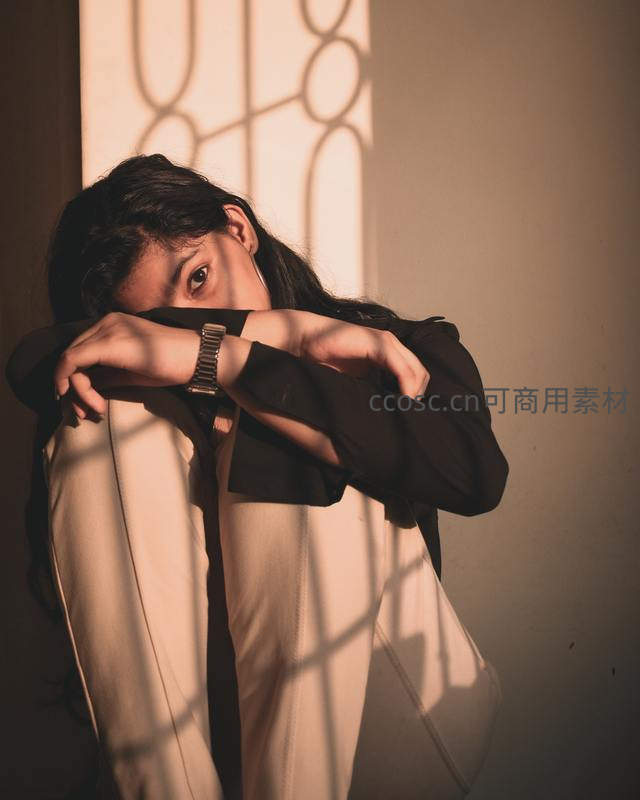 一位年轻女性倚靠在墙边,阳光透过窗棂在她身上投下几何光影,她以手臂遮面,眼神流露沉静与思索,营造出强烈的视觉叙事感。