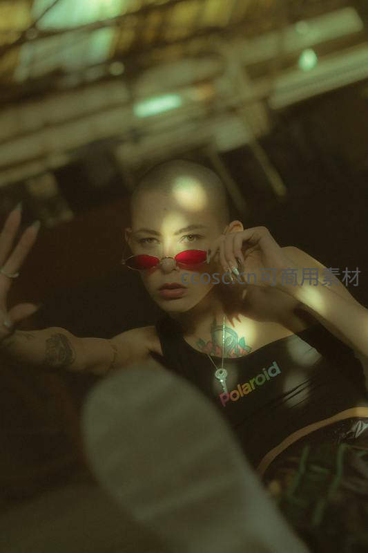 光头女子佩戴红色窄框墨镜,胸前印有Polaroid标志,手臂纹身若隐若现,置身于斑驳光影的工业环境中,散发强烈个性与前卫时尚气息。