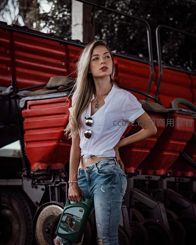 金发女子身穿休闲白T和破洞牛仔裤,手提绿色机油桶,站在红色农用拖拉机旁,微风拂动发丝,展现现代农场女性的力量与自由。