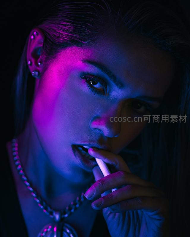 在深邃的黑暗背景下,紫蓝色霓虹灯光勾勒出一位女性的侧脸轮廓,她眼神锐利,唇间夹着一支电子烟,佩戴着闪亮耳钉和项链,散发出神秘而前卫的气息。