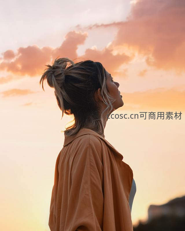 一位女子在绚烂的晚霞映衬下,侧身仰望天空,金色的阳光为她的发丝和轮廓镀上光边,展现出一种与自然融为一体、内心平和的静谧之美。