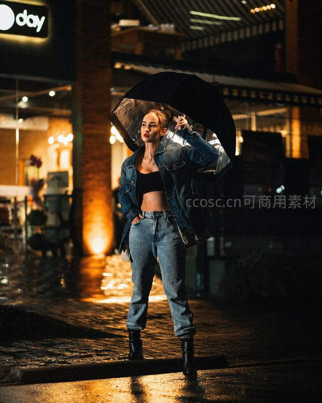 一位时尚女性在雨夜的城市街头撑着透明雨伞,霓虹灯光映照在湿漉漉的地面上,营造出迷离而现代的都市感。