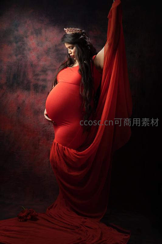 孕妇身着深红长裙头戴小冠,侧身站立于暗红背景前,红色布幔飘逸如王袍,孕肚曲线在光影中如满月,尽显庄严与母性光辉。