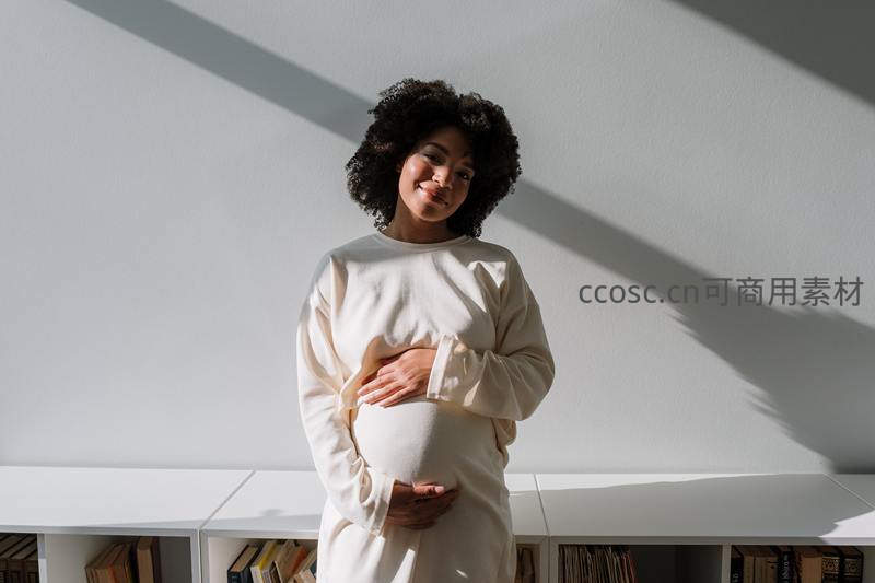 一位黑人孕妇在洒满阳光的室内,身穿米白色长裙,轻抚隆起的腹部,脸上洋溢着幸福与宁静的笑容,展现母性的温柔与期待。