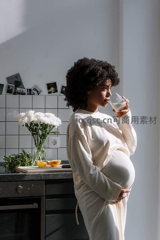 厨房里喝牛奶的孕妈,享受健康日常