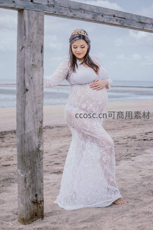 海滩木架下孕妈温柔抚肚