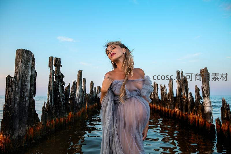 孕妇身穿淡紫色薄纱礼服,伫立在海水中的古老木桩之间,仰头闭目享受夕阳余晖,水面倒影与天空色彩交织,画面诗意浪漫。