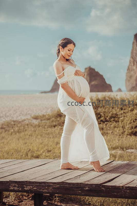 海边木栈道上的白衣孕妈剪影