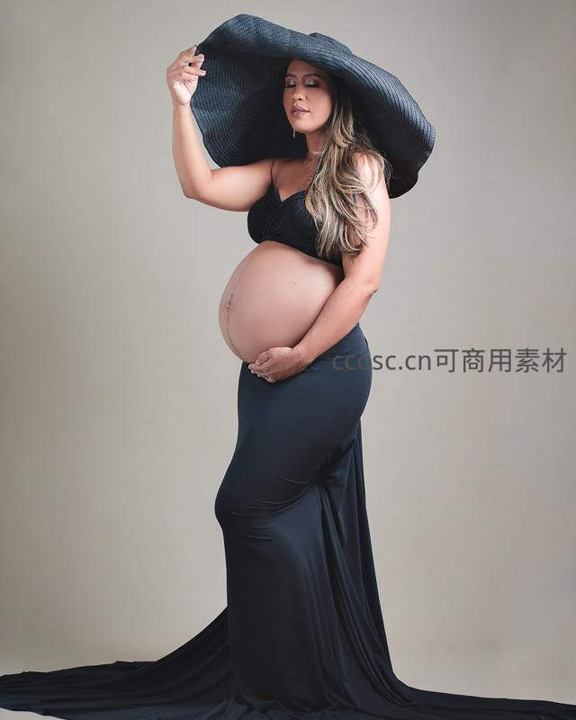 孕妈身着修身黑色长裙,手扶巨大黑色宽檐帽,姿态从容优雅,简约背景突出其曼妙身姿与时尚品味,尽显孕期高贵与自信魅力。