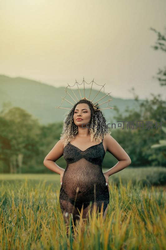 一位孕妈身穿黑色透视礼服,头戴金色光环,在金黄的田野中昂首挺立,背景是朦胧山峦,展现出力量与柔美的完美结合。