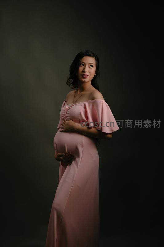 身着柔美粉色露肩长裙的孕妈,在深色背景前轻抚腹部,目光柔和,整体氛围温馨高雅,尽显母性的光辉与从容。
