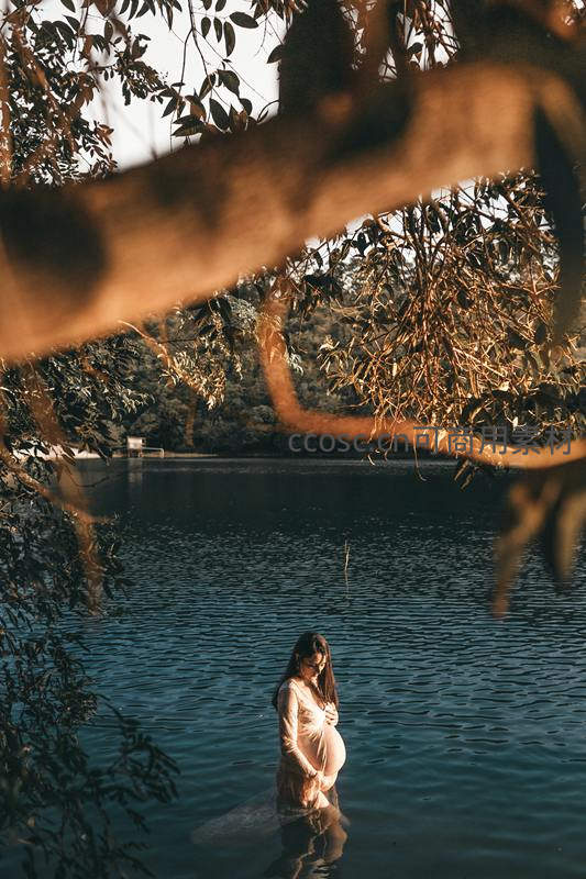 透过交错的树枝,孕妇静静站在湖水中,水面倒映她的身影,光影斑驳,营造出一幅诗意而宁静的自然画卷。