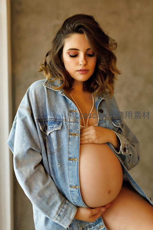 孕妇穿着宽松牛仔外套,轻柔地托住孕肚,眼神低垂,妆容精致,背景简约,突显女性在孕育过程中的自信、温柔与时尚感。