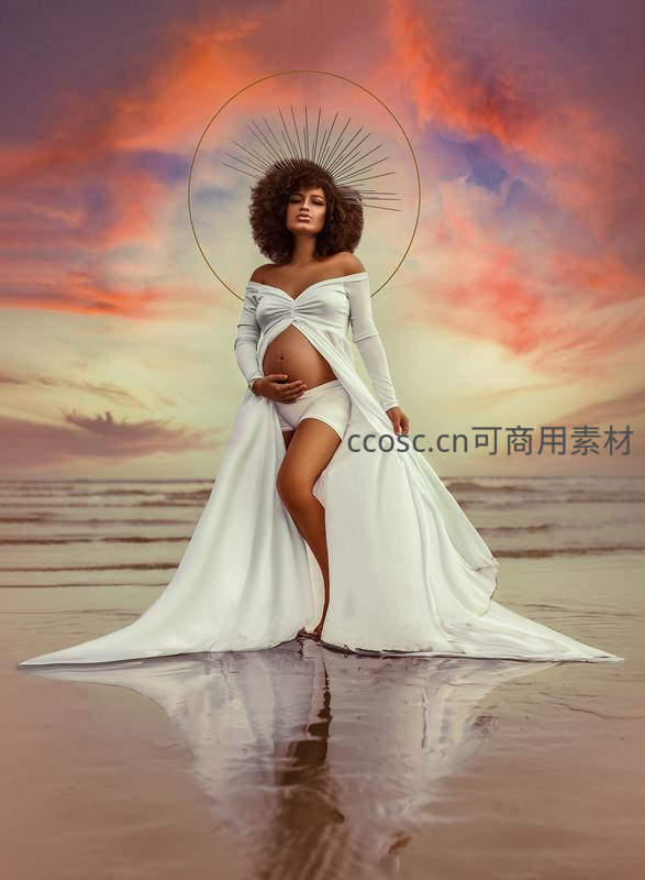 孕妇站在落日余晖的沙滩上,身着飘逸白裙,头顶金色光环,水面倒映身影,营造出圣洁、庄严又充满希望的视觉效果。