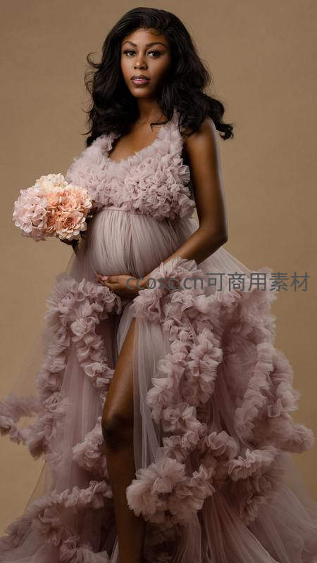 黑人孕妇身着华丽层叠粉色纱裙,手持同色系花束,姿态端庄自信,背景柔和统一,凸显其高贵气质与孕育生命的神圣感,宛如艺术画作。