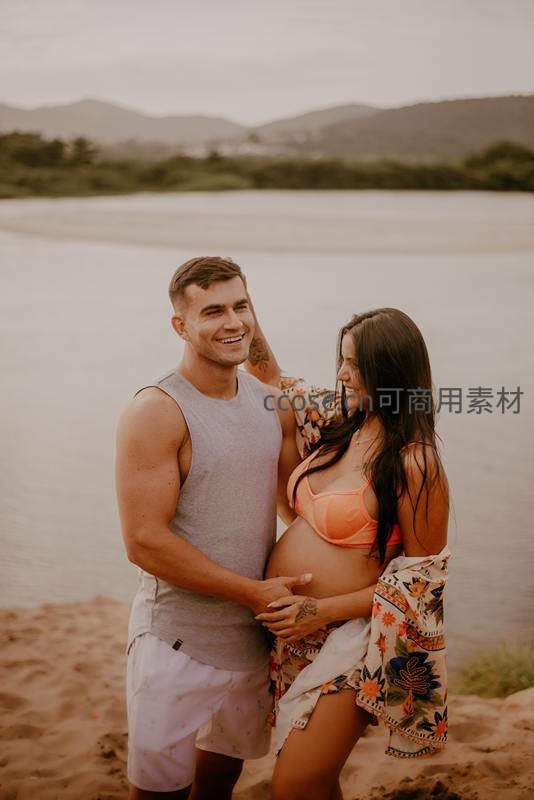 一对准父母在沙滩上相拥而笑,身后是平静湖面与远山,阳光洒落,定格了他们迎接新生命的喜悦时刻。