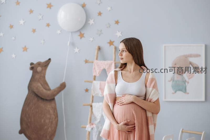 孕妇侧身站立,目光投向墙边举着气球的毛绒熊玩偶,房间布满金色星星贴纸和婴儿衣物,整体色调柔和,营造出童话般的孕育时光。