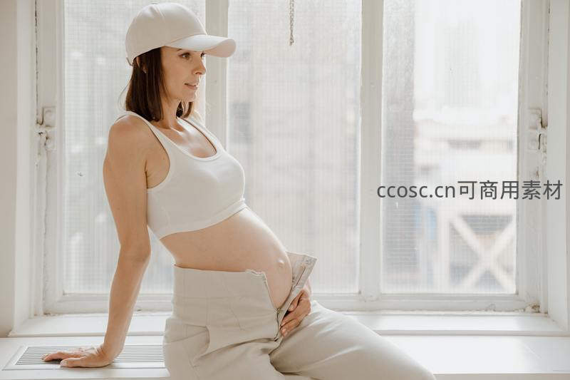 一位身穿白色运动背心和浅色长裤的孕妇,头戴白色棒球帽,安静地坐在窗台边,手轻抚孕肚,目光投向窗外,神情宁静而充满期待。