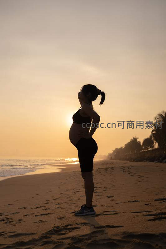 在金色夕阳的映照下,一位孕妇以优雅剪影伫立沙滩,手抚孕肚凝望远方,海风轻拂,尽显孕期女性与自然和谐共处的宁静与力量之美。