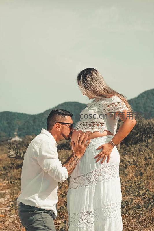 在开阔山野背景下,丈夫深情亲吻妻子孕肚,妻子身穿白色蕾丝长裙,两人互动充满爱意,自然风光衬托家庭幸福。