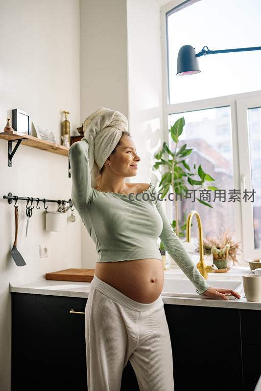 孕妇头裹毛巾,站在明亮的厨房窗前,享受温暖的阳光,神情宁静满足,体现了孕期生活的舒适与平和。
