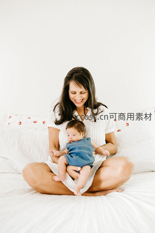 一位母亲盘腿坐在洁白的床上,怀抱着穿着蓝色小衣的婴儿,脸上洋溢着幸福的笑容,整个画面纯净温暖,充满家庭的甜蜜与安宁。