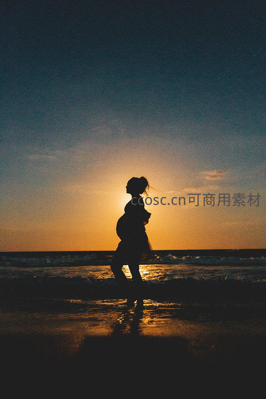 夕阳下海边孕妇剪影漫步的诗意画面