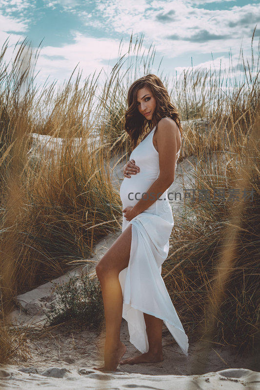 一位身着飘逸白裙的准妈妈赤脚站在沙丘草丛中,轻抚孕肚,眼神温柔而充满期待,背景是蓝天白云与摇曳的芦苇。