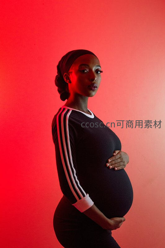 在浓郁的红色灯光下,一位孕妇身着黑色条纹运动装,侧身站立,双手轻柔环抱隆起的腹部,眼神坚定而温柔,充满力量与期待。