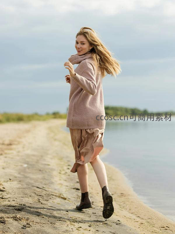 金发少女身穿粉色毛衣和短裙,在宁静的湖畔沙滩上欢快奔跑,微风吹拂秀发,脸上洋溢灿烂笑容,尽显自由与活力。