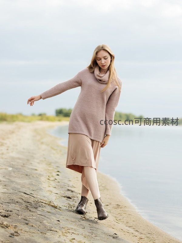 女子穿着柔和色调的针织衫与半裙,在湖岸边缓步前行,姿态轻盈优雅,背景是平静的水面与远处树林,营造出宁静文艺的氛围。