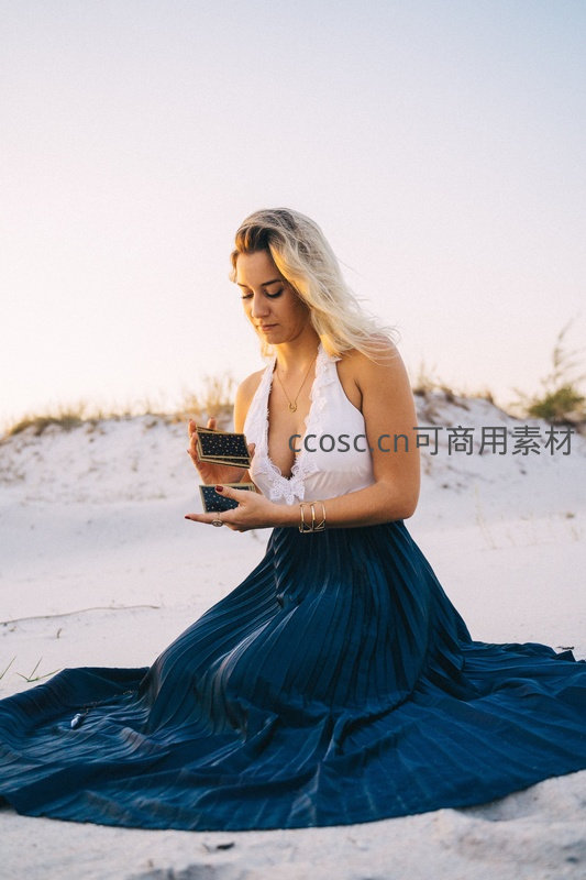金发女子身着深蓝色长裙,静坐于沙滩之上,手中捧着精致首饰盒,目光低垂若有所思,背景是柔和的黄昏光线,充满诗意与遐想。
