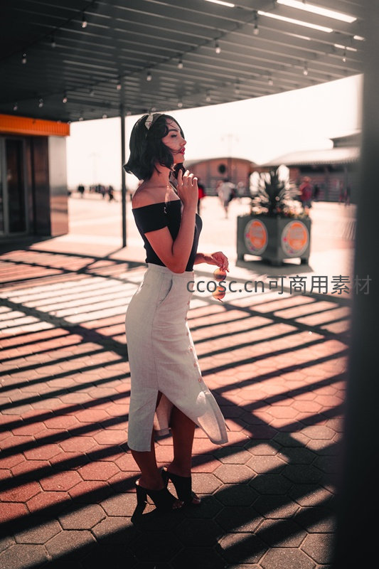 一位穿着黑色上衣和白色开叉长裙的女性在阳光与阴影交错的街道上摆出优雅姿态,背景是现代建筑与行人。