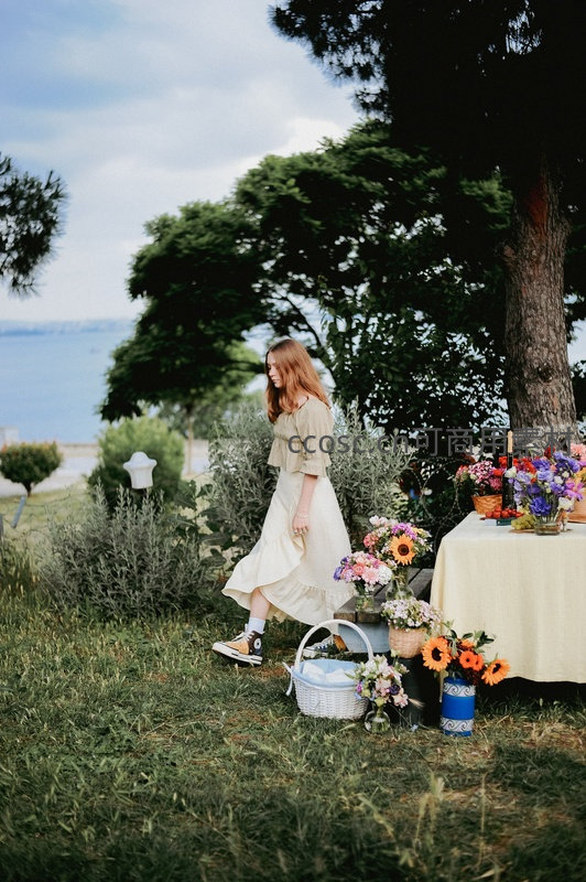 在绿意盎然的湖畔花园中,一位女子漫步于花丛间,身旁是摆满鲜花与美食的野餐桌,尽显悠闲假日风情。