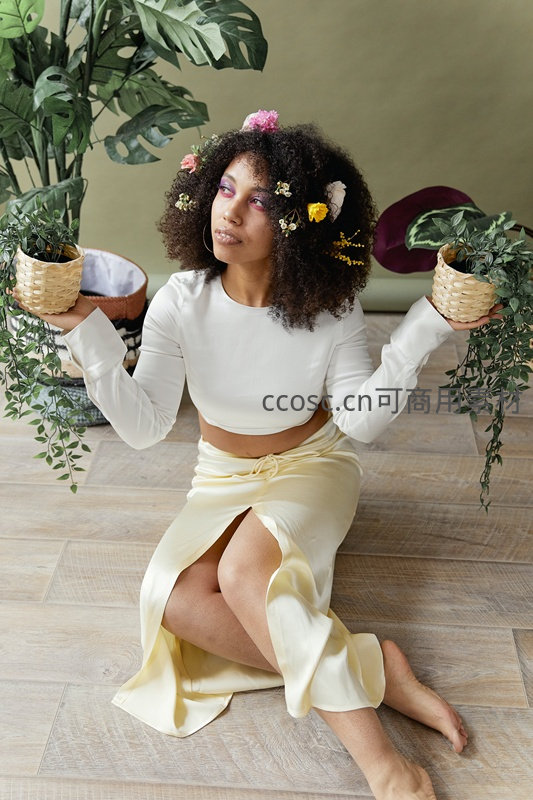 一位卷发少女头戴花环,身着白色上衣与米色长裙,手捧绿植盆栽,置身于充满生机的室内环境中,展现出宁静优雅的生活美学。