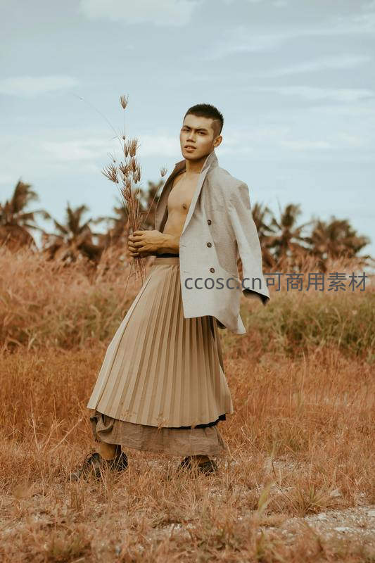 一名男子赤裸上身,外搭浅色西装外套,下着米色百褶长裙,手握一束干草,站在金黄的田野中,背景是椰林与天空。